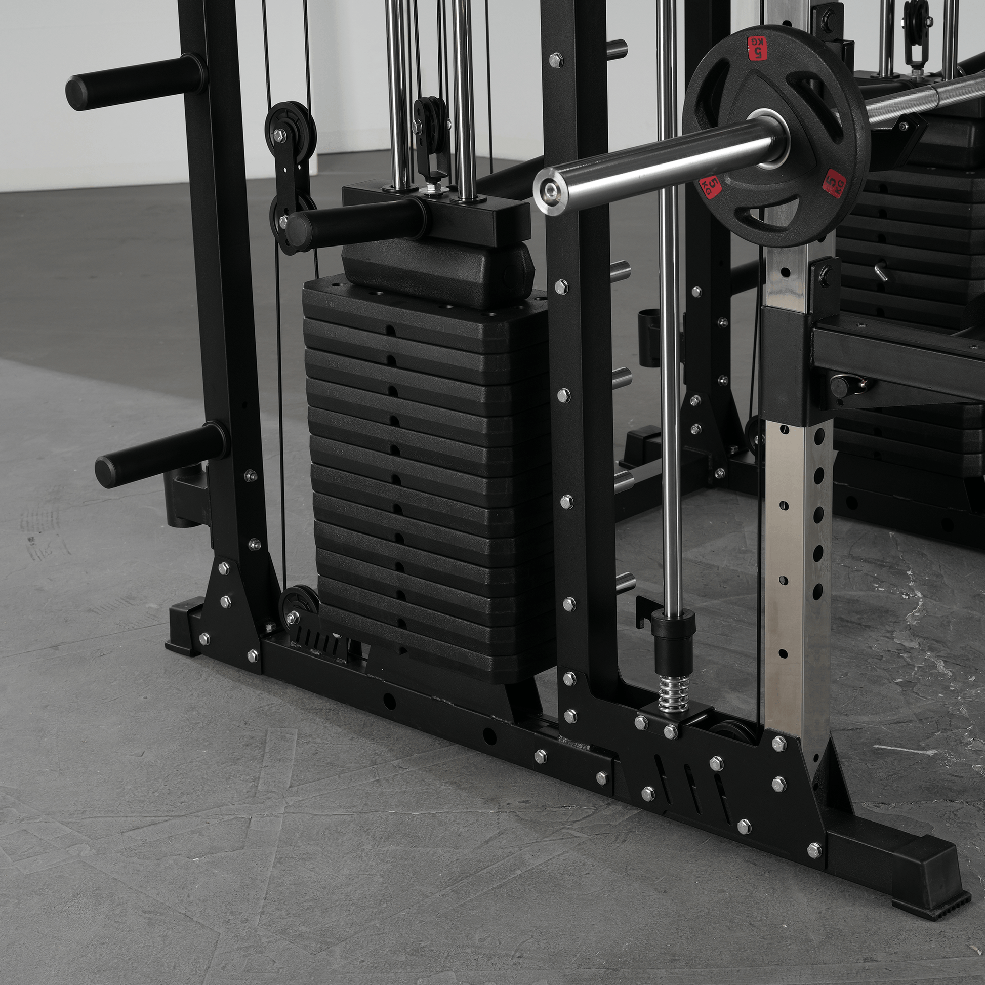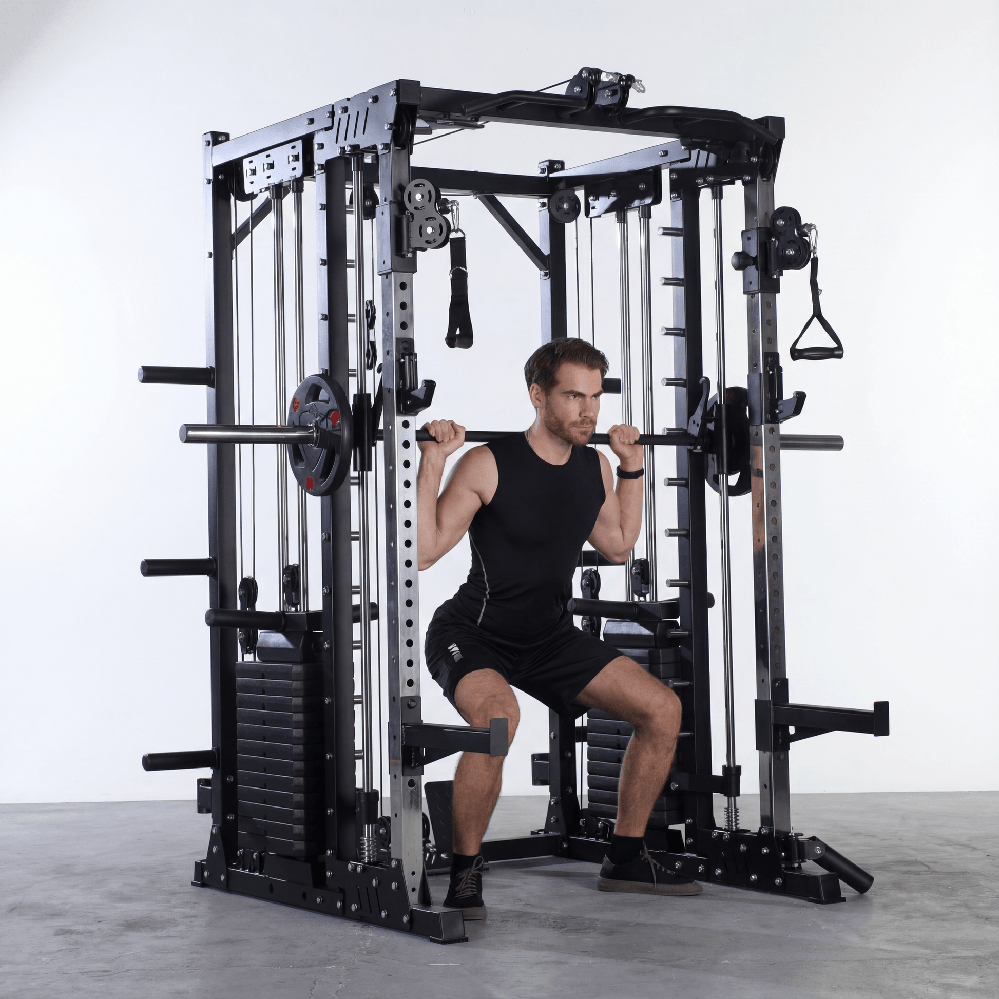 Full Smith system, dual 70 kg weight stacks, adjustable cables, multi-grip pull-ups, lat pulldown storage for barbell & plates, and more -